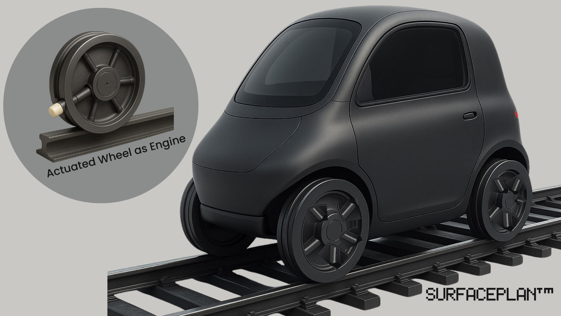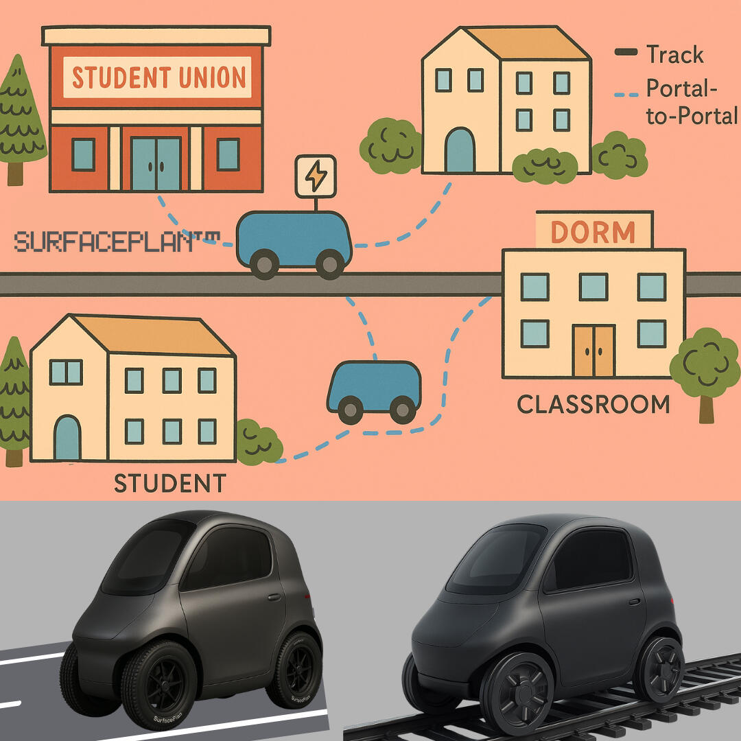 • SurfacePlan starts with one breakthrough idea: the wheel itself is the engine - not as a bulky hub motor, but through lightweight actuators at the ground surface. From this design, an entirely new kind of lightweight, flexible transportation system becomes possible. • UltraLight Rails: Because propulsion happens in the wheels, pods don’t need heavy engines or drive systems. The track can be lighter and cheaper, even simple concrete rails. • Portal-to-Portal: Pods can run efficiently on rail, then drive off-track to reach final destinations creating seamless door-to-door transport. • Integrated Charging Made Simple: Unlike rubber tires, SurfacePlan wheels have actuators at ground level. That makes them perfect for direct contact with embedded charging pads or coils in the rail. Energy flows right where the wheel touches, without extra connectors. Pods can charge while waiting or moving, which means smaller onboard batteries are possible. • Radical Body Designs: With no heavy drivetrain to design around, pods can be built for specific needs from wheelchair-accessible rear-entry pods to cargo carriers or other specialized uses. • Scalable & Flexible: Pods can operate independently or link together as a train, adapting to demand without needing traditional engines.