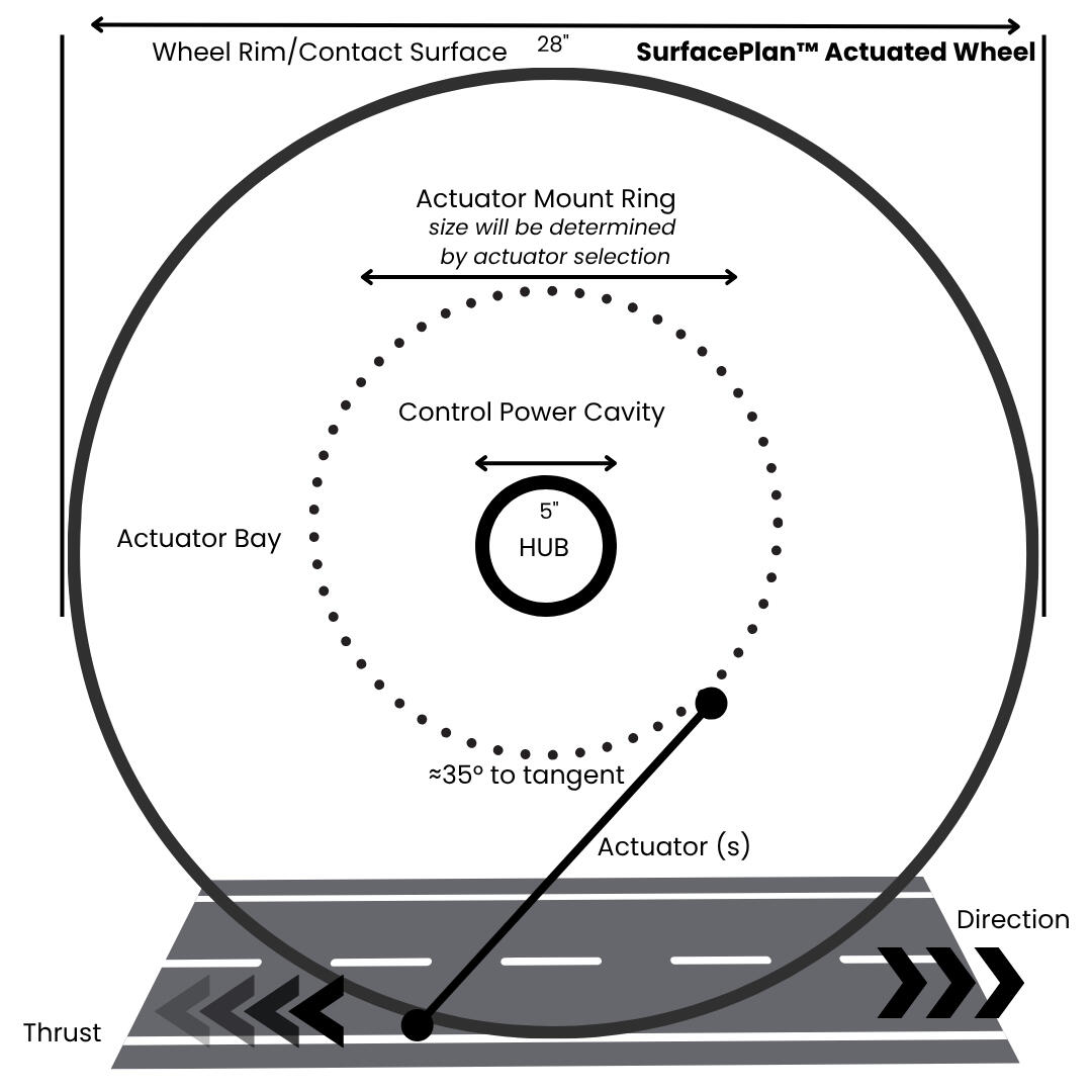 Q: Won’t the actuators just push up and down, causing bumping instead of forward motion?A: No. Like a pneumatic tire, the actuator tips and surface skin are designed to deform at the contact patch, converting force into tangential thrust. Sequencing them in traveling waves creates smooth propulsion - think more inchworm glide than jackhammer.Q: Isn’t this just a wheel hub motor?A: Hub motors apply torque at the hub, turning the whole wheel. SurfacePlan eliminates torque transfer entirely by generating propulsion directly at the road contact patch. Instead of one big motor, each wheel has multiple distributed actuators that are programmable, redundant, and efficient.Q: How does SurfacePlan affect vehicle aerodynamics?A: SurfacePlan shifts propulsion from centralized drivetrains to the wheel interface itself. By eliminating transmission tunnels, driveshafts, and bulky mechanical assemblies, vehicle architecture can be reconfigured around aerodynamic efficiency rather than drivetrain packaging constraints. While final drag characteristics depend on full vehicle design, decentralized propulsion enables lower profiles, cleaner underbodies, and reduced frontal area compared to conventional layouts.Q: Won’t multiple inverters and cables make this too complex and expensive?A: A hub motor concentrates all power into one heavy unit that needs thick cabling and a high-capacity inverter. SurfacePlan spreads the work across many light actuators, so each needs only a small pulse of power. That means lighter wiring, simpler electronics, and a common power bus instead of dozens of separate inverters. The control brain is lightweight and directs timing, not heavy current, the opposite of “complex and expensive.”Q: How is traction managed on ice, gravel, or mud?A: Each actuator is like a pixel of motion. Instead of a fixed tread, SurfacePlan can reprogram its traction profile in real time thus optimizing grip per surface, something no passive tire can do.Q: Isn’t a tire already good enough at traction?A: A tire is one big, molded object. Its tread is always passive, and every rotation it meets the road the same way. Even clever tread designs or dual-compound tricks are still passive. SurfacePlan is active: each actuator is its own mini motor, programmable in real time. That gives variability in how the wheel handles terrain and road surfaces - something no molded tread can match.Q: What about unsprung weight and ride quality?A: In today’s cars, “unsprung weight” is defined relative to a heavy drivetrain sitting on top of the suspension. With SurfacePlan, vehicles will get lighter because the engine and drivetrain disappear. That changes the balance entirely. And unlike a rigid hub motor, our actuators themselves can provide compliance absorbing some shock naturally.Q: What’s actually being suspended - the whole car?A: In conventional vehicles, the suspension has to carry the engine, transmission, driveline, passengers, cargo, and batteries. With SurfacePlan, the heavy driveline disappears. The only things that really need suspension are the passenger, payload, and a reduced battery bank. Each wheel’s actuators act like mini shock absorbers at the contact patch, and elbow-type joints (part of our patent) provide steering and added suspension control.Q: What about ride comfort?A: Today’s suspension systems react after the bump. SurfacePlan wheels can eventually act as active suspension, softening impact at the contact patch or even predicting and canceling it before it happens. That’s comfort built in at the wheel.Q: What about durability, dirt, potholes, and wear?A: Durability is an engineering and materials challenge, not a show-stopper. The actuator tips carry a stretchable outer skirt that moves with them, shielding the mechanism from grit and debris. Wear parts are modular and replaceable (more like brake pads than tires). Short strokes and sealed paths limit intrusion, and because the whole vehicle is lighter, impact forces are far lower than on today’s cars.Q: Won’t the actuators just get caked with mud like normal tires?A: Mud is a huge challenge even for today’s best off-road tires as they fill up, smooth out, and stop working. SurfacePlan is different: the “tread” isn’t fixed. Each actuator can flex and fire to shed mud on demand. That means the wheel can actively clear itself instead of waiting for rotation and centrifugal force to maybe fling debris out.Q: What if one actuator jams? Won’t that cause failure?A: Redundancy is built in. A wheel contains multiple actuators, and the control system simply routes around a fault. One stuck actuator doesn’t disable the wheel - it gets isolated and scheduled for maintenance.Q: Does it coast, or is every stroke wasting energy?A: Current pneumatic tires rely on constant air deformation, which wastes energy as heat. SurfacePlan actuators can lock in place, letting the wheel coast without kneading a big rubber carcass. Efficiency must be measured at the system level: one wheel replaces the motor, gearbox, driveshaft, differential, much of the braking, and some suspension; a cascade of weight and energy savings.Q: What about heat dissipation?A: Heat is actually easier to manage in SurfacePlan wheels than in a single big motor. Each actuator produces only a tiny pulse of energy, spread across the entire circumference. That distributes heat over a large surface area right at the tire edge, where airflow naturally cools. Instead of finding ways to vent a large, buried motor, heat is managed passively and evenly.